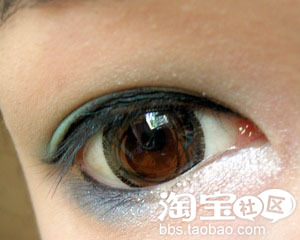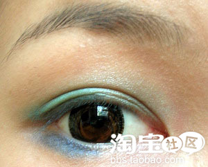 第一步,用锥形眼影刷沾取蓝色(因为都是蓝色,也不知道怎么称呼,所以直接称浅蓝、蓝、深蓝,看图片就明白。),在双眼皮范围内由眼尾向前至眼睛约1/2或2/3处内上色。