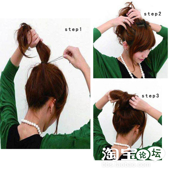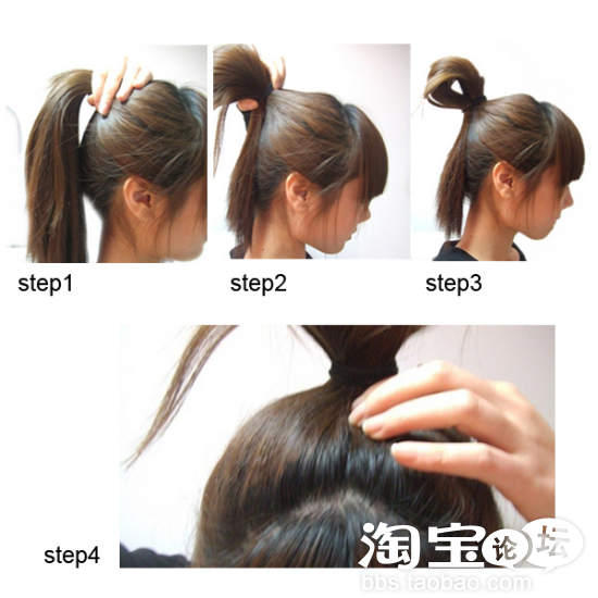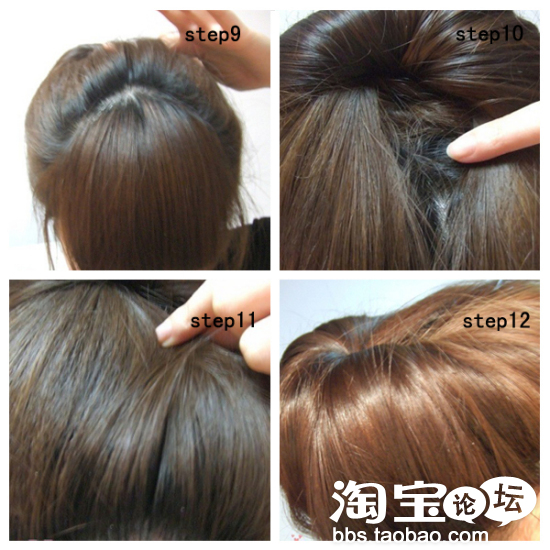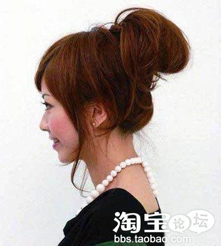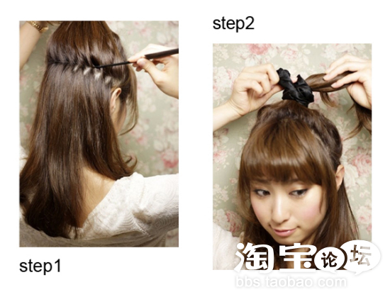 把头发高高的梳起一个马尾,并握起一个拳头大的发箍,用皮筋固定,然后把马尾上的头顶中间部分的头发挖一个小洞