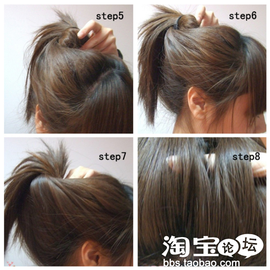 把头发高高梳起马尾,从马尾的发尾开始向内卷起