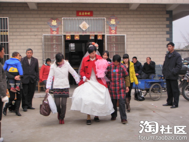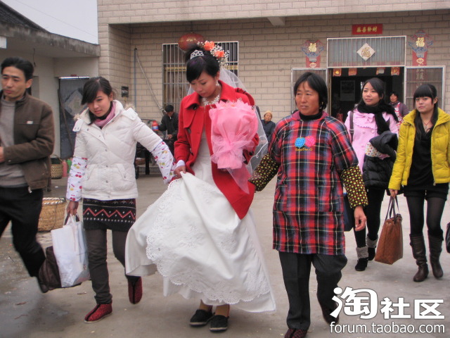 脚上穿的弟弟的鞋子,我们那得习俗。必须有福气好儿女双全的长辈搀着,二妈还穿着干活时的围裙呢~~