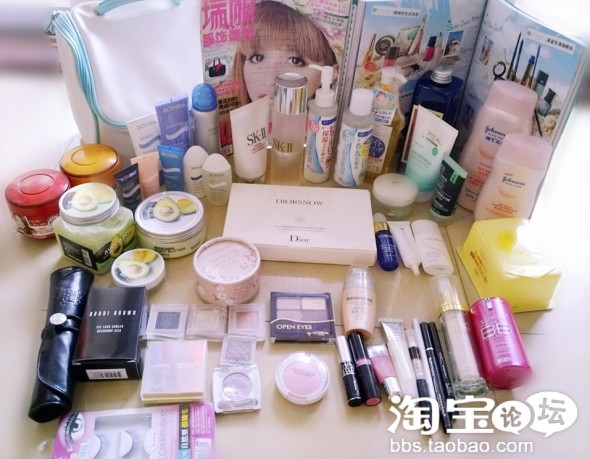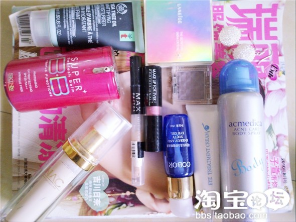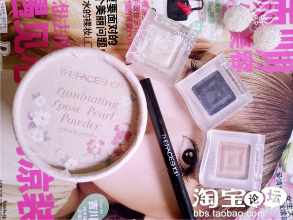 桃花珠光散粉+3盒眼影(为了宴会而买的,平时没多大用处,太闪了),黑色软头眼线笔,快干,不晕妆,很好用