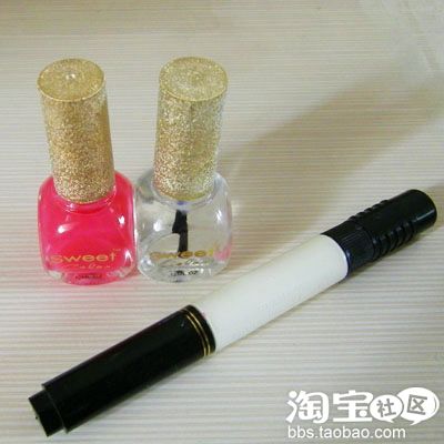 工具超级简单啊,就三个,1.粉色指甲油 2.亮油 3.白色点花笔