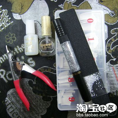 从左到右1.一字剪 2.胶水 3.亮油 4.银色点花笔 5.挫条 6.珍珠 7.法式甲片