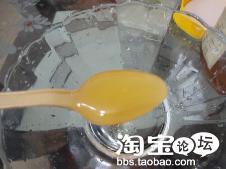 然后将事先调好的温开水倒一勺稀释在蜂蜜中(1:1比例)