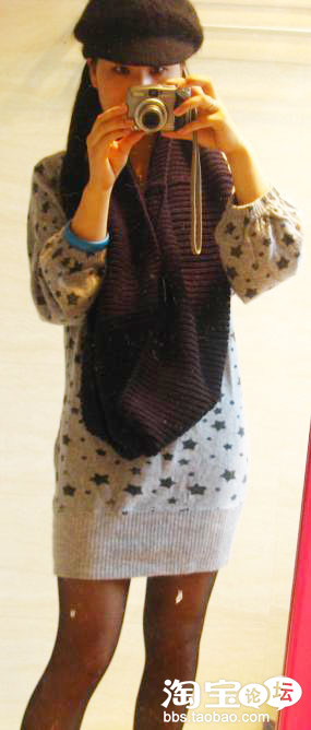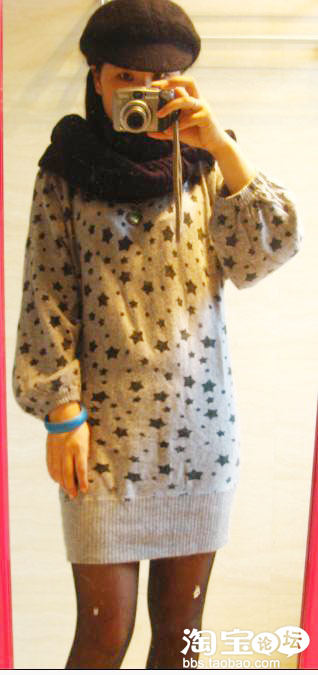 高贵的紫色羊毛棒针外套搭配灰色五角星打底毛衣是秋冬御寒的一大法宝哦