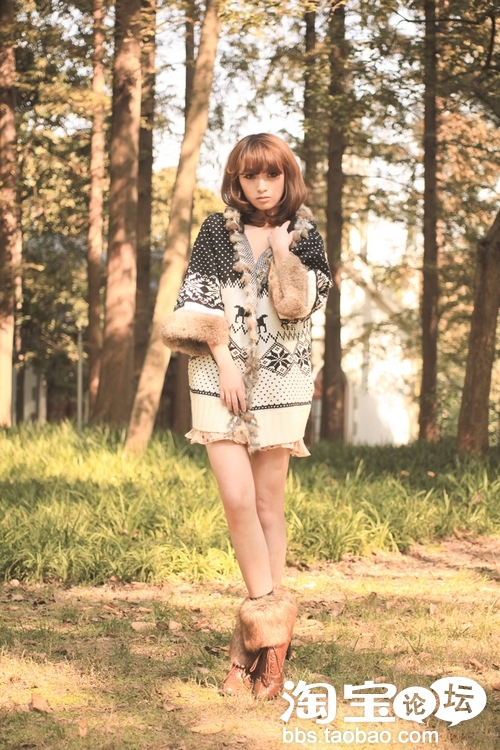 麋鹿雪花真毛领连帽毛衣外套+水玉点点高腰拼接百褶雪纺连衣裙 +尖头骑士短靴+毛毛靴套