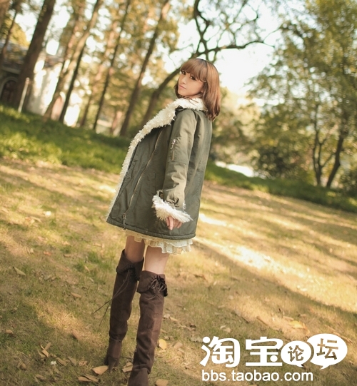 羊羔绒军装风大衣外套+波点雪纺束腰日系连衣裙+及膝长靴