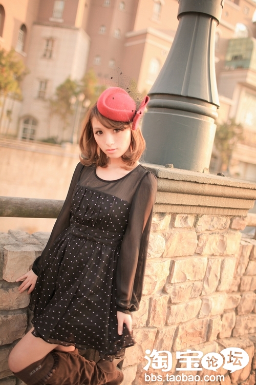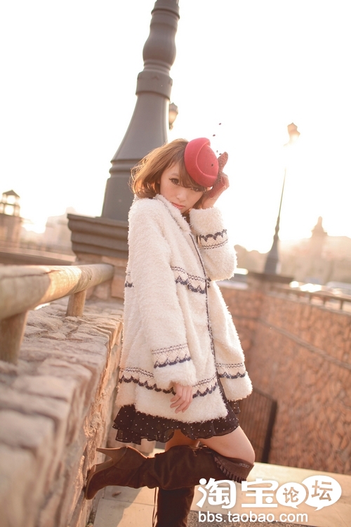 snide波点雪纺束腰日系连衣裙+日式开身连帽花边拉链毛毛大衣+及膝长靴+欧单大蝴蝶结Party羊毛帽子