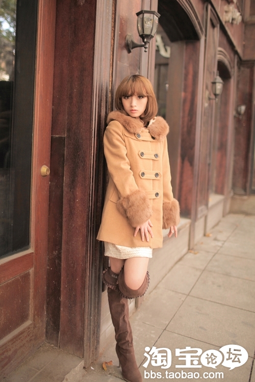 学院风牛角口大衣保暖呢子大衣+日式圆领开身花边收腰雪连衣裙 +蓝色HM长围巾+毛毛短靴