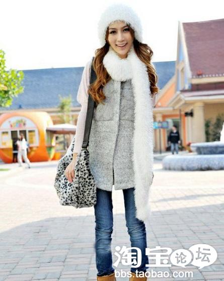 模特这一条搭配可爱又有点小奢华的味道在里面,很喜欢这个长款的羊毛马甲,胸前可爱的兔毛更是甜美范十足,在秋季应该是很好搭配衣服的。