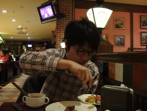 低头猛吃的他