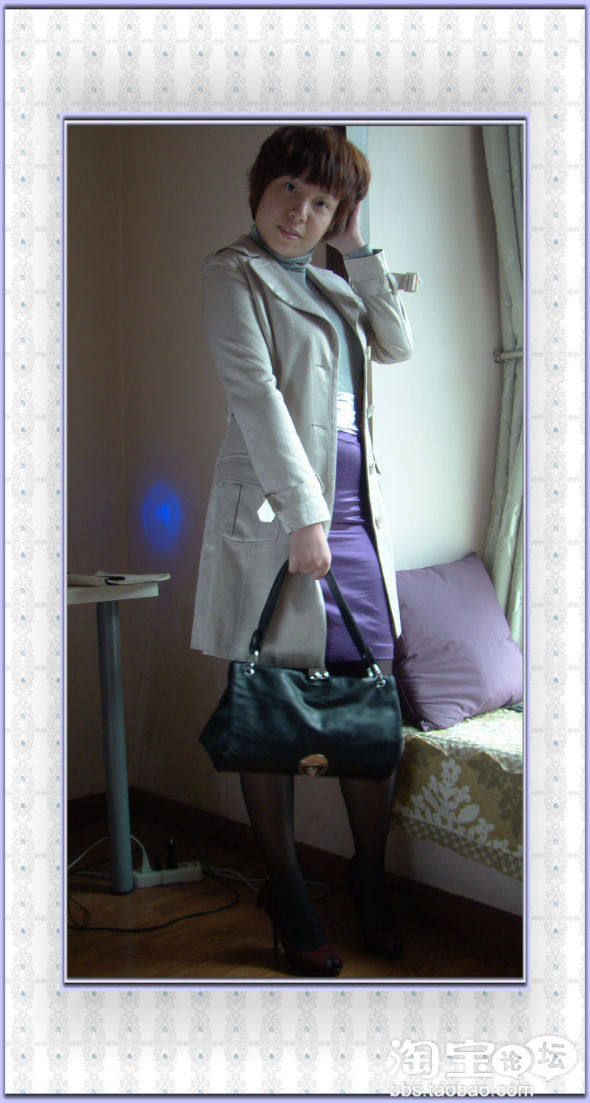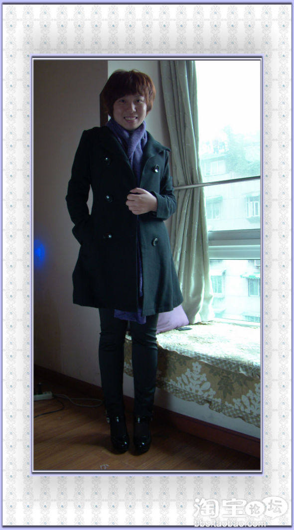 选了毛呢双排扣中长大衣+黑色铅笔裤+黑色高跟鞋+针织高领衫+紫色羊毛围巾,黑色的一身很酷,很保暖,又很有质感,对我这种略有点肉肉的女人来讲,修饰了并不完美的曲线,搭上紫色的羊毛围巾,带着温暖的冬日气息,一丝柔柔的女人味。