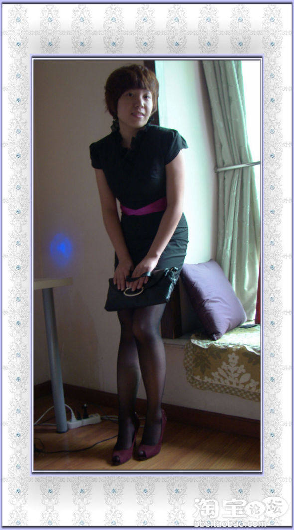 选了黑色带花边花苞袖直身裙+黑色丝袜+紫色单跟鞋+黑色小提包,不会过分职业,却又女人味十足。