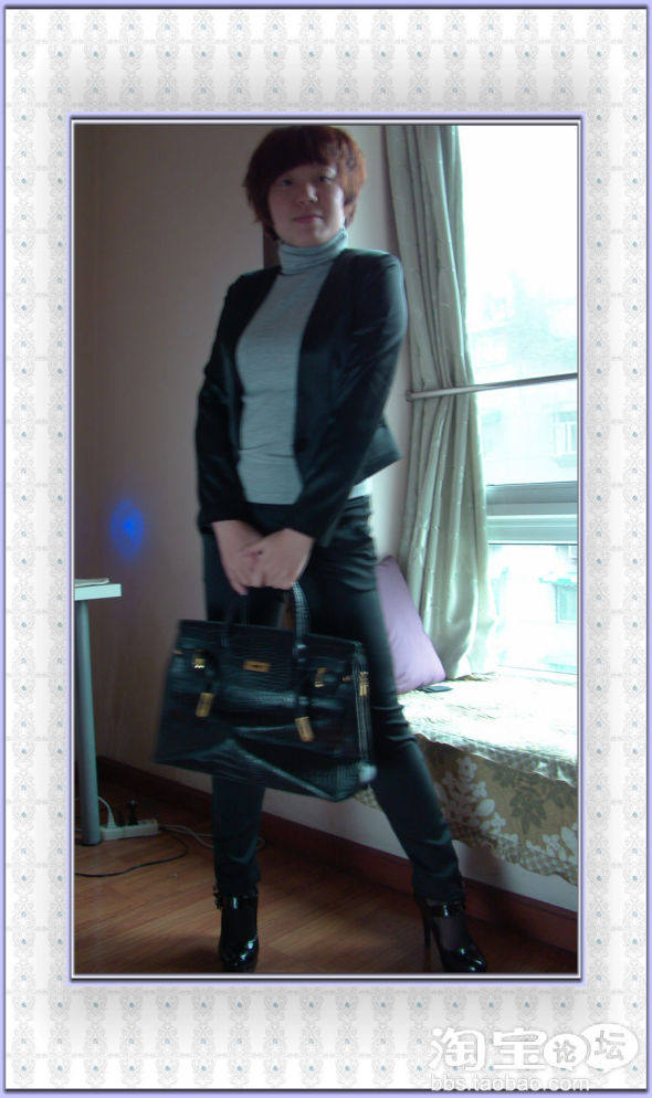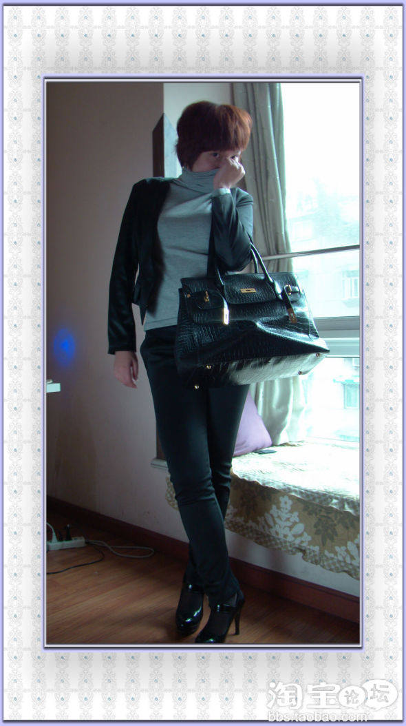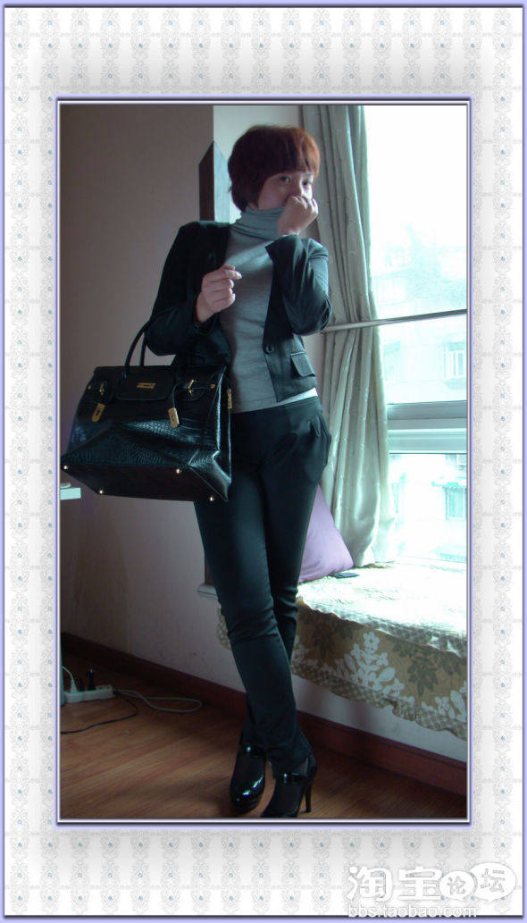选了挺阔成型的黑色高腰小西装+黑色铅笔裤+黑色高跟鞋+针织高领衫+质感大包包,感觉很精神高挑。而且铅笔裤一定要搭高跟鞋才会很有范儿,不然会显得腿很短,之所以穿这双鞋是因为虽然很高,但是防水台很高,走路很舒服。