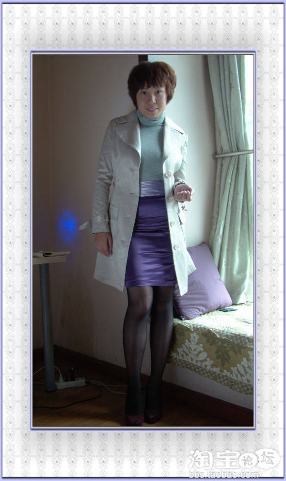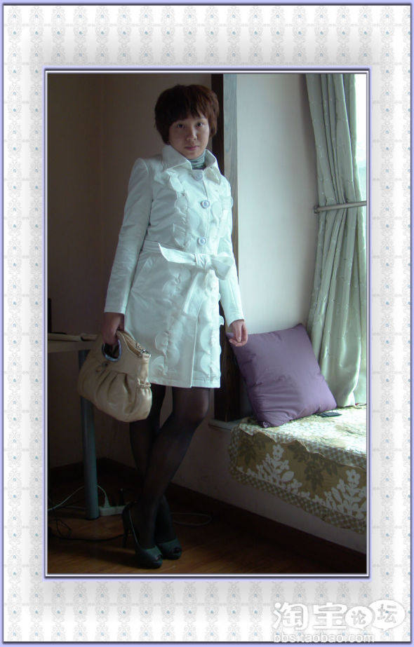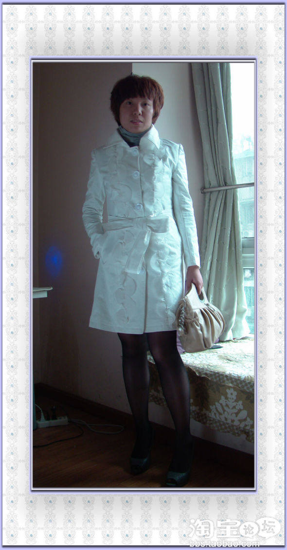 选了白色带花边风衣裙+灰色高领衫+米色提包+黑色丝袜+灰色鱼嘴鞋,看起来又淑女又大方,不管自己什么年纪,在父母面前永远像个小孩,永远是那种乖乖牌,永远都长不大,但一个可爱的自己。
