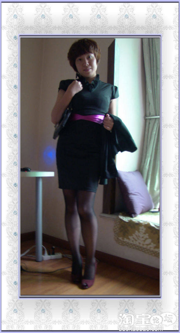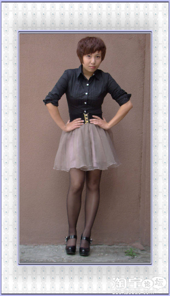 选了百搭的黑色简洁衬衫+高腰蓬蓬裙+黑色高跟鞋+黑色丝袜,很显瘦,又不会显得太过孩子气,有点小女人的小可爱。剪了短发以后似乎特别适合个性点的打扮,但在老公面前,永远是比较小鸟依人的感觉。唯一一天,化了点淡妆。