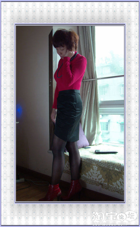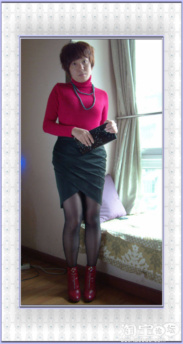 选了红色高领衫+黑色前叉包裙+红色及踝靴+绿松石长项链,谁说不能红配绿,我就是这么低调却又抢眼。