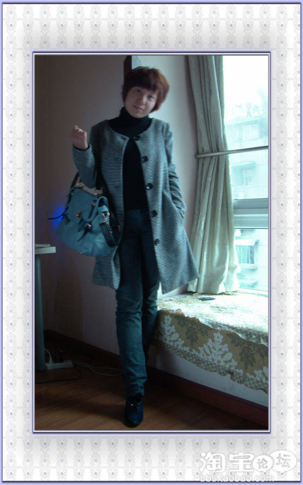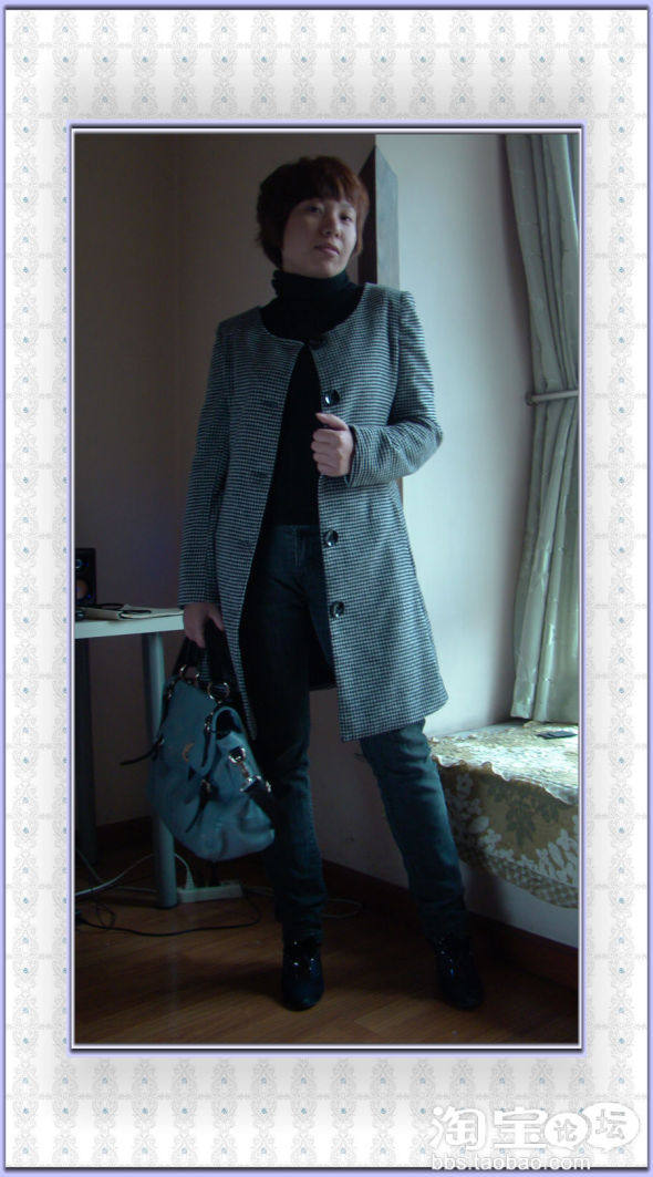 选了黑白灰小格子和尚领羊绒大衣+黑色高领衫+灰色窄脚牛仔裤+蝴蝶结蓝色及踝靴+蓝色手提包,有点小休闲,舒适大方,闲适自在。本来想戴个兔毛的帽子,但是剪了短发以后就不太合适,戴上帽子以后就像没有头发似的,所以长发的MM可以尝试。想说,原来我戴帽子挺好看的。