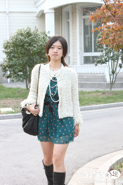 圆点雪纺连衣裙+黑色公主外套+长靴