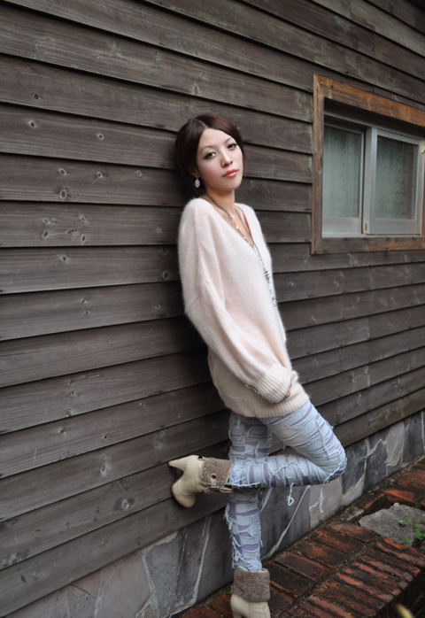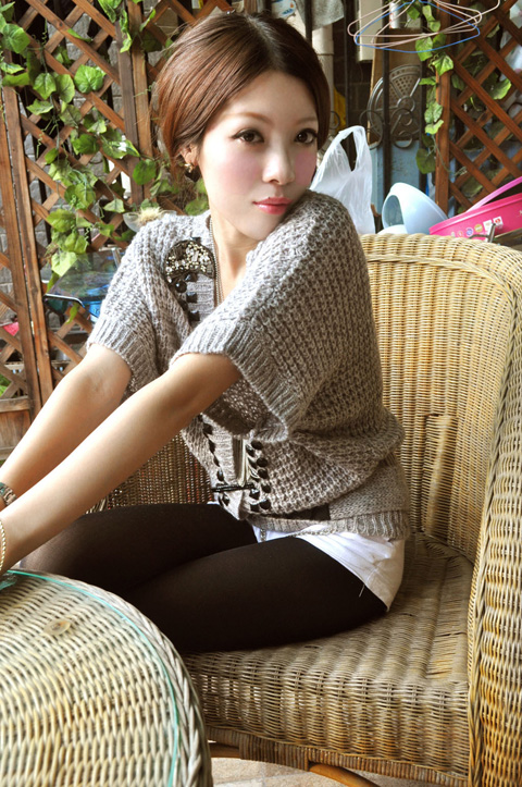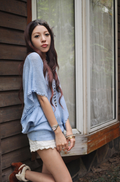 淡淡的香草兰色,柔软的粗针马海毛,可当裙子可做上衣的一款百搭,V字勾花领和蝙蝠袖袖口花边让非主流气息的它带有一丝淑女气。举手投足间,温暖和美丽都停留在了你的身边。顺便说说这条小短裤,也是针织质地的,有内衬,在秋冬用来配搭长款毛衣外套绝对的百搭,TINA很多衣衣都是用它来衬的哟~~
