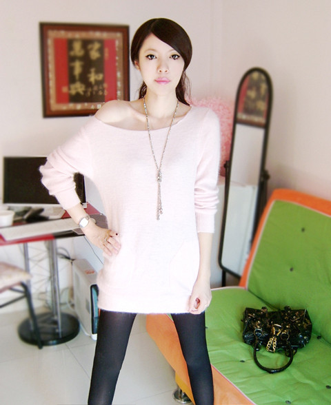 暖暖的肉粉色适合做任何搭配,大大的V领短角沟边简洁而大方,双口袋又不失乖乖女的身份,虽然手腕部是包紧的,但却是蝙蝠袖设计。衣衣设计主要体现在线条上,衣领是可以斜肩穿的,后背是一排开衫的扣子。其实衣服可以前后两穿,前面是口袋毛衣,后面是开衫毛衣。