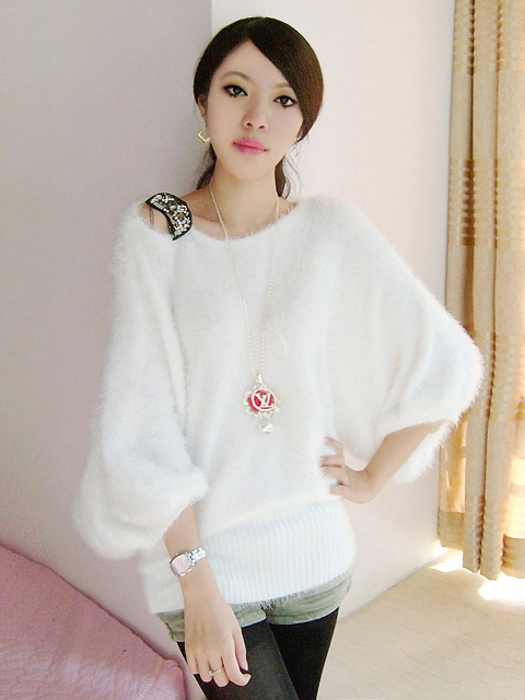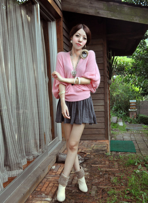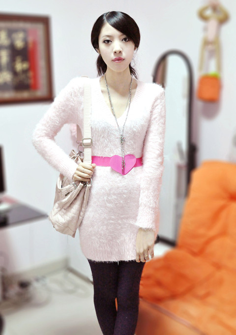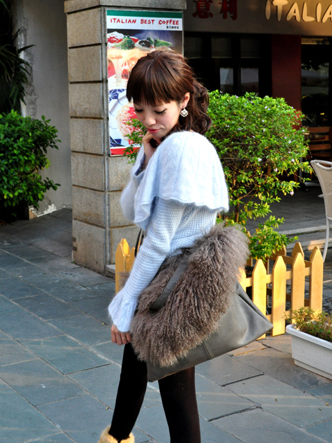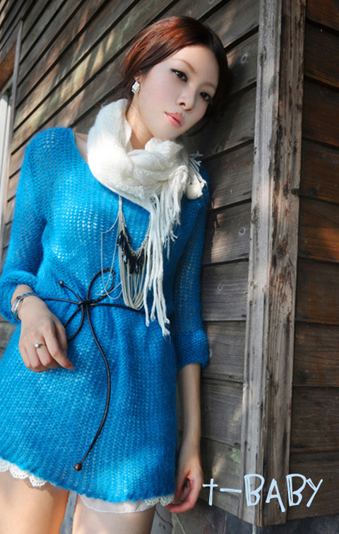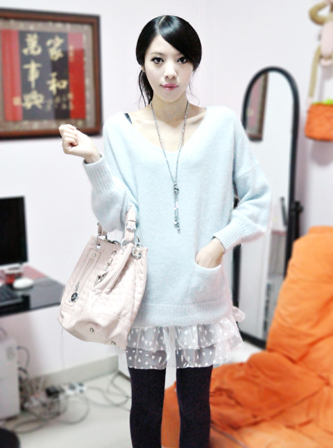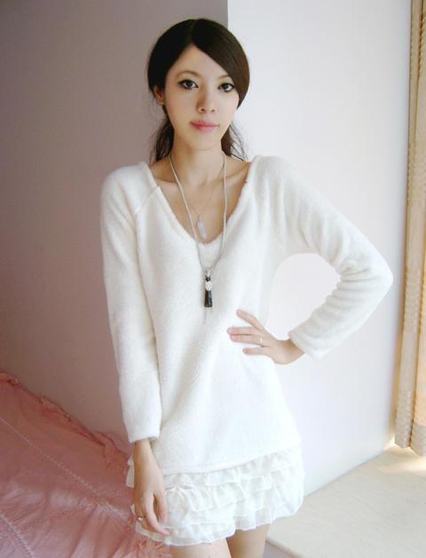 非常少见的淡雅的浅蓝色纯兔毛,非常大大的V领短角沟边简洁而大方,双口袋又不失乖乖女的身份,虽然手腕部是包紧的,但却是蝙蝠袖设计。衣衣设计主要体现在线条上,背后开衫背扣设计,衣领是可以斜肩穿的,袖子是从肩以下5公分开始分袖。配上白色的小桃心白色网纱短裙,淡淡的甜美气息。