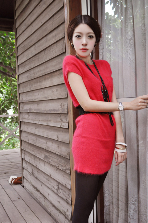湖蓝色/火红色 纯兔毛连身裙有着很鲜艳很美的颜色,光是这一点就已经可以成为拥有它的理由了。软软的兔毛绝对不会扎身。有大红和湖蓝两个颜色,都是亮色,衣衣款式也很简洁,TINA身高是165,长度刚刚好,但由于喜欢穿短的偏好,特意系上条宽腰带在腰部将衣衣稍微往上扯松一点,衣衣就可以当超短连衣裙来穿了,这样配袜子比较好看。如果比较高的MM,配靴来穿就可以不用系腰带都很好看,衣衣本身就收腰的。
