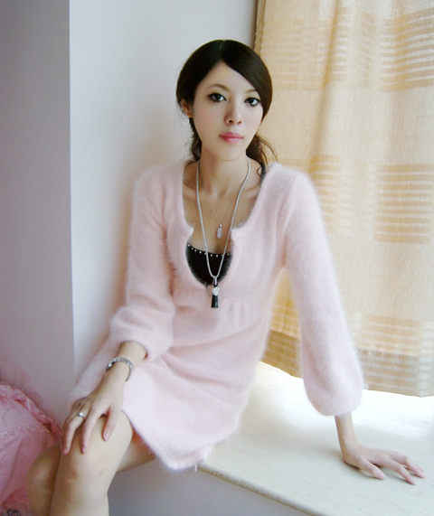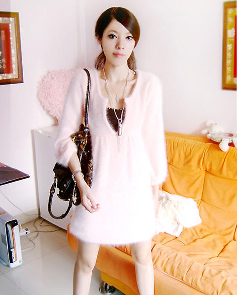 此款为经典爆款毛衣裙,颜色非常正,长毛兔毛绒,毛毛绒绒特别柔软舒适。市面普遍盗版均无水粉色及嫩黄色,而有粉色的卖家均是09版短毛旧版的棕粉色。而图片TINA身上穿的长绒毛水粉色,现时国内一般厂家均不能染出这种水粉色。要染出这种水粉色,必须要高温上色,而高温却会破坏掉在兔毛的毛线纤维。所以这款水粉色在原材料染色工艺上做了重大突破,完全做到了保证兔毛毛线的柔软毛绒性之余又上了一层谈谈的水粉色,甜美风十足。绝对值得第一推荐。