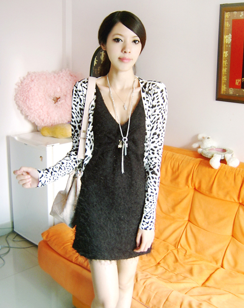 毛毛茸茸修身收腰低领黑色背心裙,看起来更像皮草的感觉,在南方城市可以单穿,不过用来搭配外套十分漂亮,衣衣得特点是比较个性,这种面料也是这一两年才流行起来的,随着混搭和中性的穿衣风格盛行,越来越特别的衣衣成了爱美的MM们的新宠。尤其是搭配黑白豹纹修身的针织短外套更是绝佳的搭配套装。