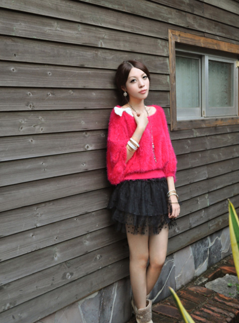 依旧是日本杂志款推荐的一款毛衣,八层的蕾丝花边,白色的条纹为正粉红色毛衣更偏向了粉,盖去了红色的艳。越偏粉越是甜美。