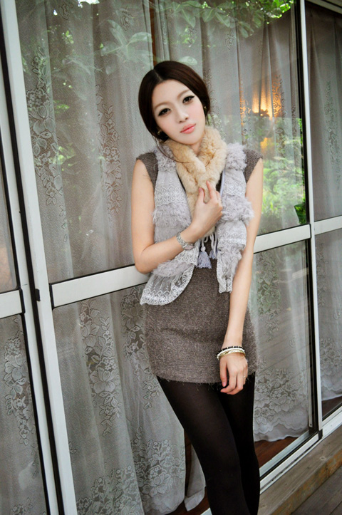 深灰色毛毛连身裙收腰效果很明显,颜色偏深的话就很显瘦,毛毛裙背后是半镂空的,隐隐约约的露背装,单穿参加PARTY很高贵气质,如果想穿低调点,就像图片这样配个毛毛马甲。马甲是浅灰色,在色系上和裙子很配,颜色层次也出来了。而在质地上都是属于今年秋冬最流行的几种棉料,马甲上的蕾丝边让整体看起来轻松很多,系马甲的绳子TINA觉得太长就多打了几个结把它变短了比较好看。。