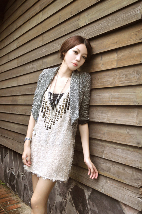 此款是TINA的最爱之一,衣衣一上身效果就出来了,一抬手一头足都很美。枚红色是韩国OL淑女风,厚实的兔毛上衣、一字领露肩、非常正的玫红色、双排扣设计、每粒扣都是闪钻装饰。最特色的是她的胸口贴钻心形镶嵌的胸花装饰。虽然是双排扣,表面看是开衫,其实所有扣子都是缝死的假开衫。搭配上黑色的性感网纱短裙,小露香肩,隐约散发出女人的甜美**。
