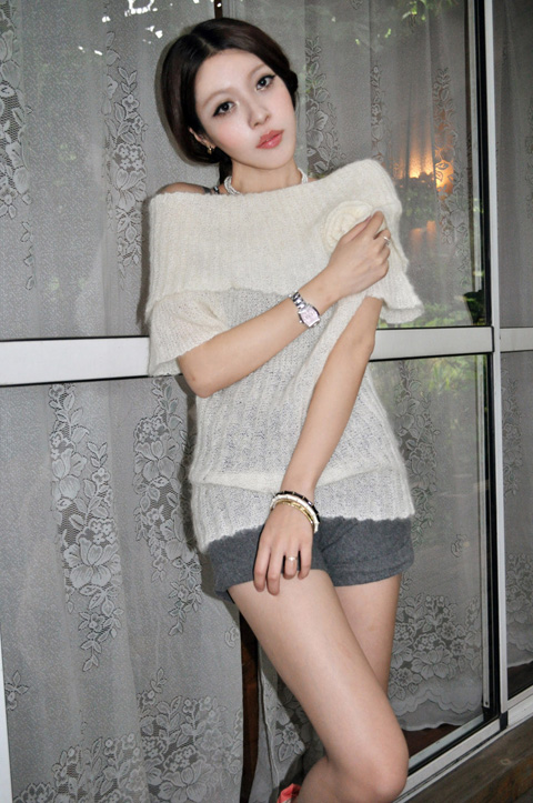 毛毛茸茸短装斜肩上衣,这也是大受好评的一款,之前都是在卖白色,没想到粉红色一推出就受到了很多MM们的青睐。这款衣衣超柔软的,套用客人们的一句话说“这是我买过最值的一件衣衣”。在这里TINA要说一下,毛毛茸茸是一字领,因为衣衣很柔软,对很多瘦小的女生来说领口会偏大,TINA也是比较偏瘦的女生,所以她穿也是一样,平时穿这件衣服的时候都是在领口位置夹起一个小胸花,夹到领口不再滑落的位置就好,可根据你个人喜爱的款式搭配胸花夹。