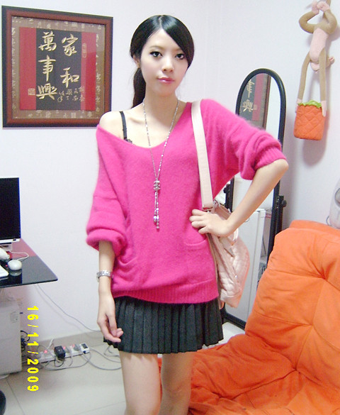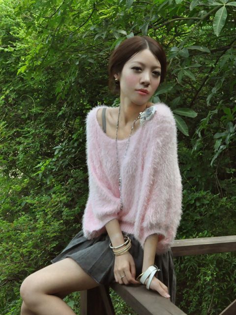 日本杂志款推荐的一款毛衣,大大的灯笼袖,蝙蝠型的衣型,一字领露肩设计,超级大的宽松身加厚款兔毛毛衣。最吸引我的是她的颜色,美美的桃红色,没有玫红的艳丽,没有水粉的淡雅,却有独享的软和红嫩。