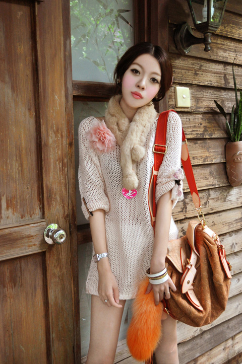 夏装巧搭冬装,蓝色针织短袖长款T恤裙打底内搭,套上正中水粉色的兔毛宽松上衣,配上浅灰色的大大兔毛围脖,黑丝裤袜,棕色毛毛靴,卡其色羊毛包包,一身下来有5、6个颜色,但是却没有任何一点不搭的感觉,这就是典型的日式粉系甜美混搭风。