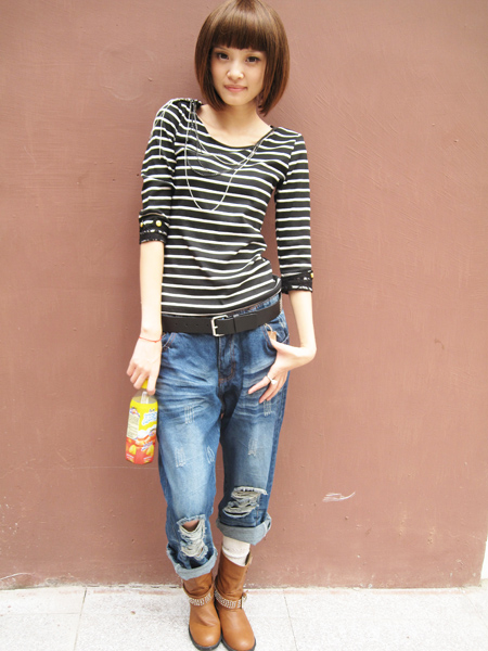 修身的条纹T配上帅气的BF版破洞仔裤,好街头好帅气哦~