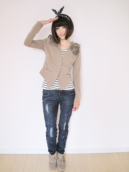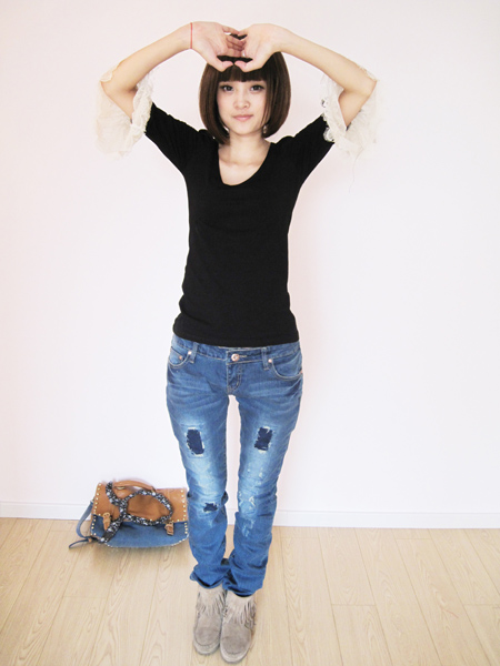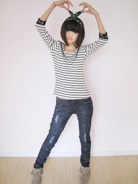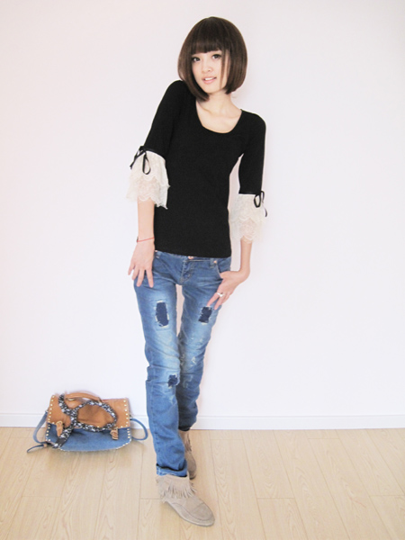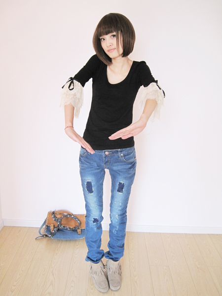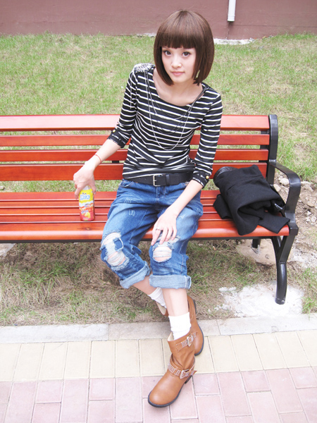 TOP,1 肩章条纹T+破洞仔裤(修身仔裤)+短靴