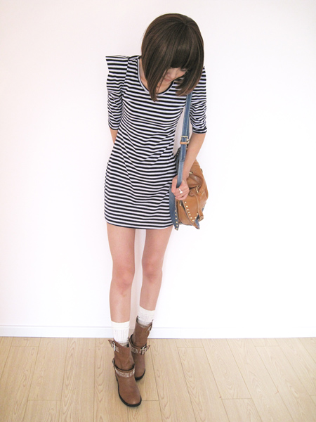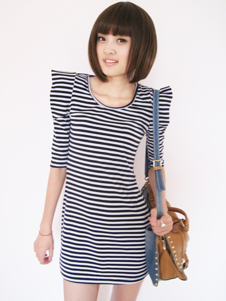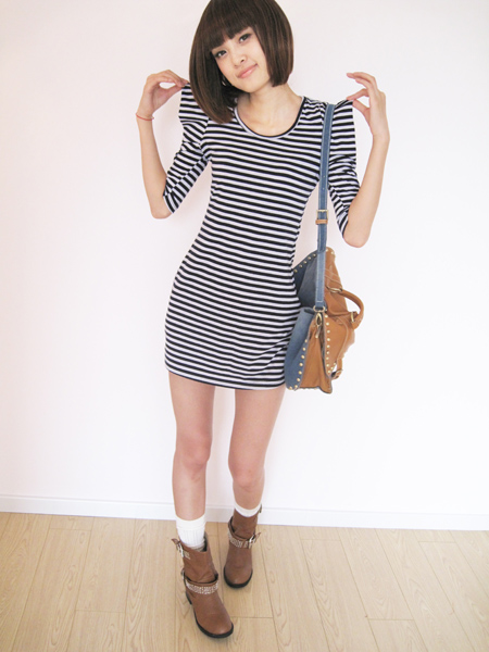 TOP,5耸肩条纹修身T裙+铆钉包包