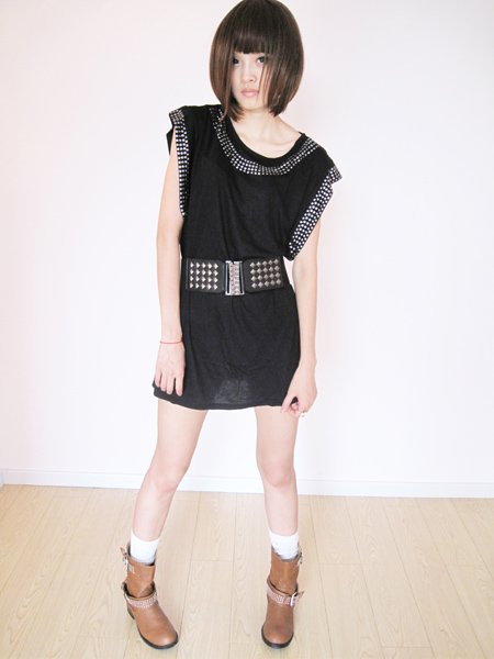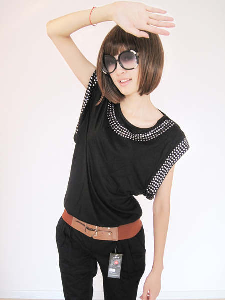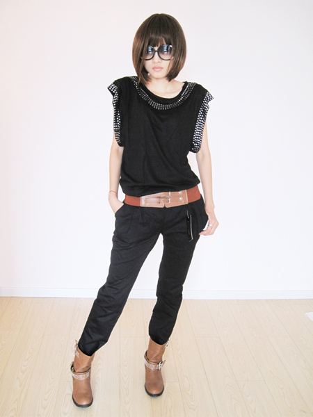 TOP,6 铆钉装饰T+黑色哈伦裤