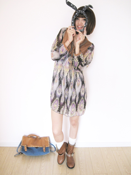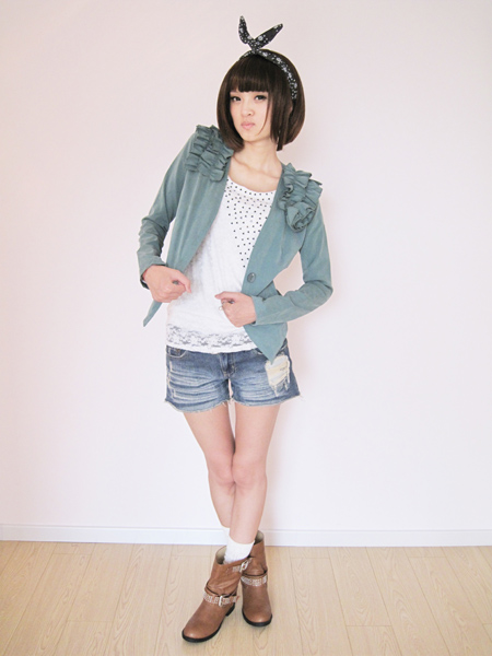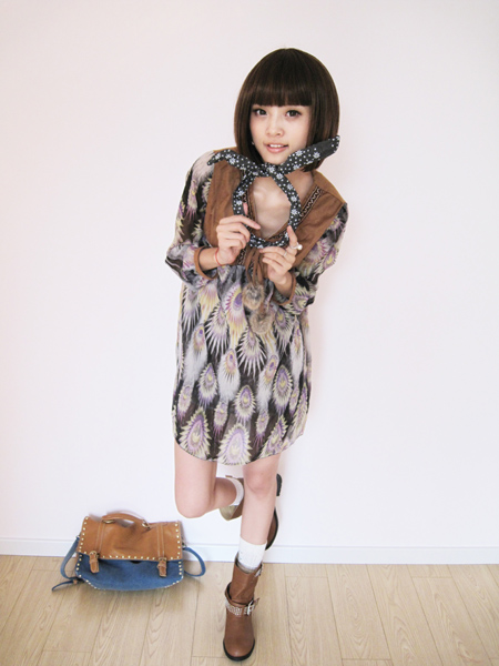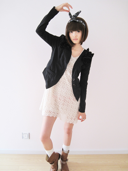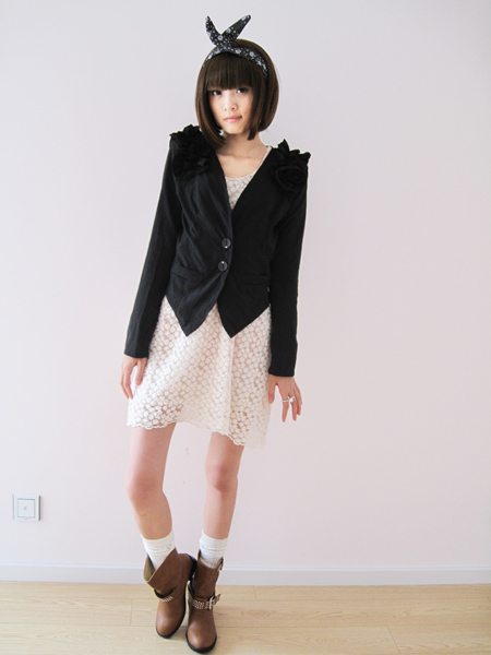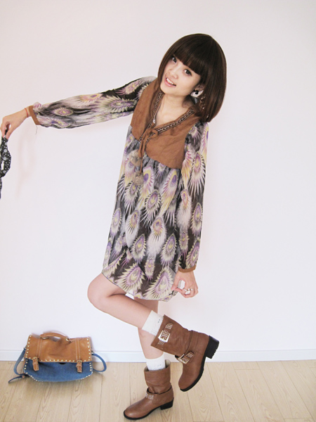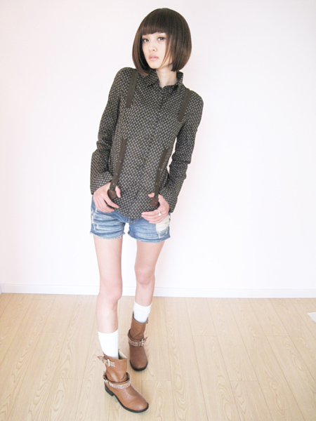 TOP,4鹿茸皮拼接雪纺娃娃衫+白色袜套+机车短靴+兔耳头饰