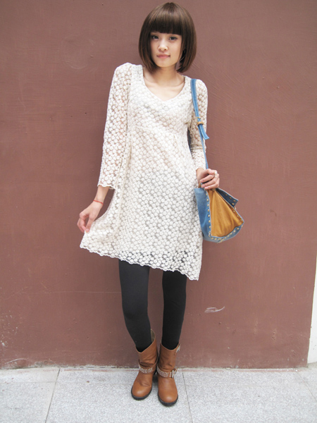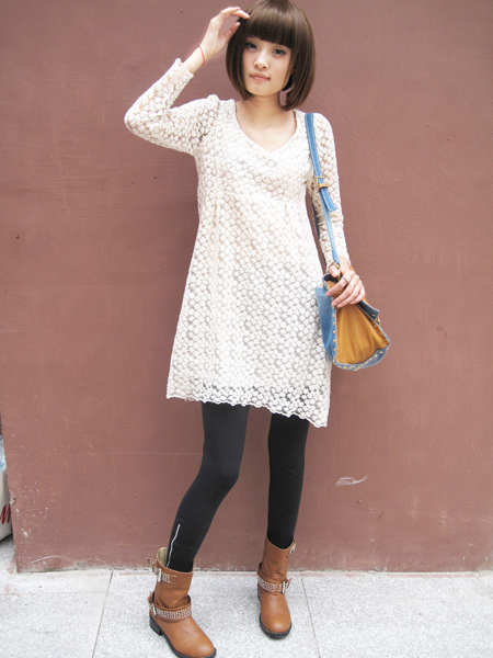 TOP,1 太阳花蕾丝连衣裙+黑色打底裤+铆钉包包+机车短靴