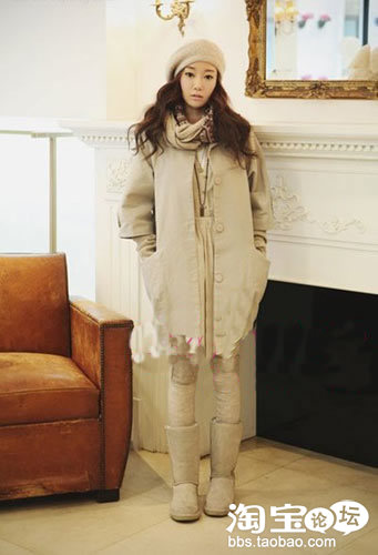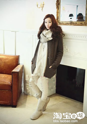 柔和的针织衫搭配米色调,最直接且亮丽的时尚风貌。一款米色雪地靴更能表现出女性温婉甜美的特质。