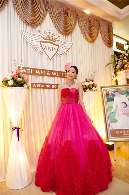 再秀我另一套,玫红色的礼服,也是有浪漫的玫瑰花组成的,颜色非常漂亮。