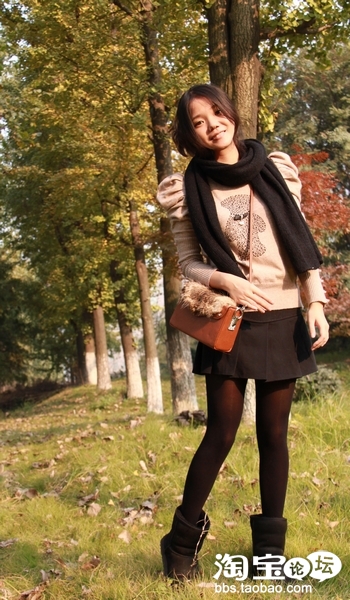 2、软绵绵开衫+破洞打底裤+UGG+水玉点点大围巾+驼色小挎包