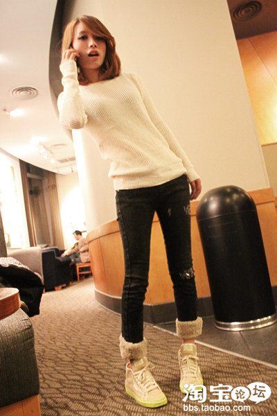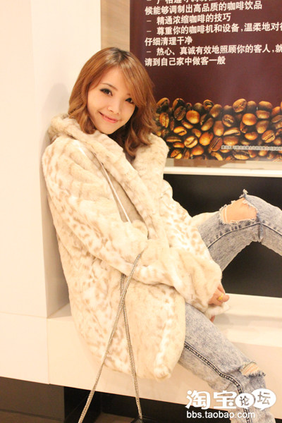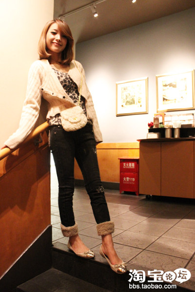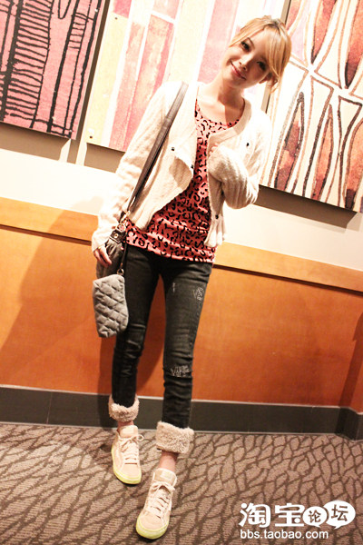 搭配二:TOPSHOP豹纹皮草+zara打底衫+破洞牛仔裤+亚历山大靴
