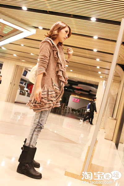 搭配二:H&M荷叶边毛衣+豹纹打底衫+九分牛仔裤+单鞋