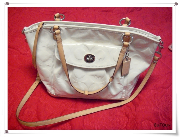 1.coach的白色大包包:这个放第一个因为这是偶第一个比较贵的包包。是亲爱的妈妈给我买的。在网上查了下,叫COACHPATENTLEAHTOTE。前年上海刚有COACH的专柜,看见这个很喜欢,老妈很豪爽的买给了我,当时原价4800还不知道是4500的,打了95折买,整整4000米啊。。。老妈太伟大了。。。。当时只觉得coach也是大牌了,但是不知道原来在美国coach打折这么厉害,最近在淘宝的美代店看见这个款式打折才1200多,悲剧啊。。。。不过打折的美代outlet款只能单肩,没有斜跨带,而且啥颜色都有,主要是玫红,但是决没有白色滴~~~小小安慰下我。。。反正以后买coach只在淘宝买,坚决不去专柜,国内的专柜太坑人啦