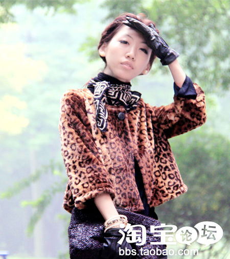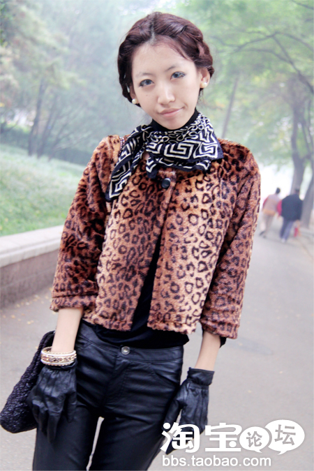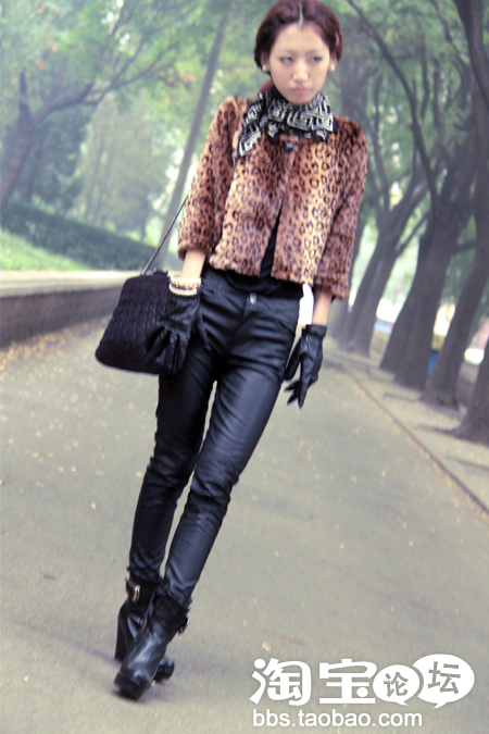 豹纹皮草小袄+皮裤+坡跟黑色皮靴