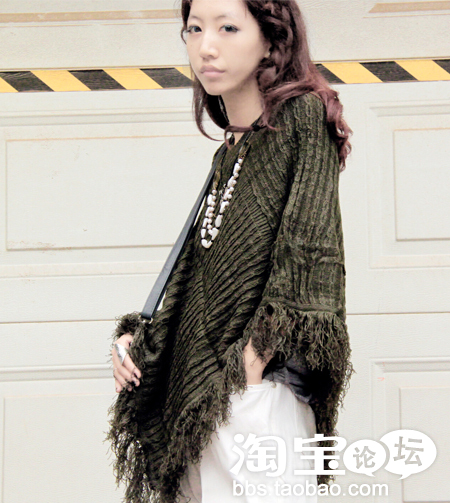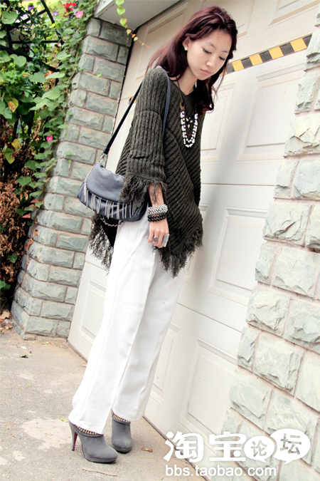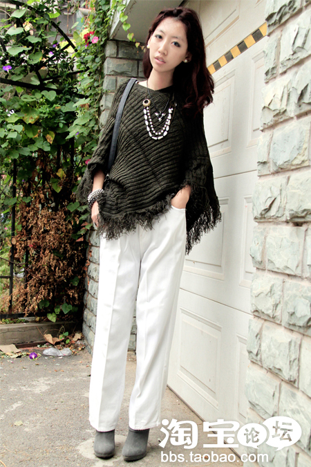 军绿色针织加厚斗篷+白色高腰裤