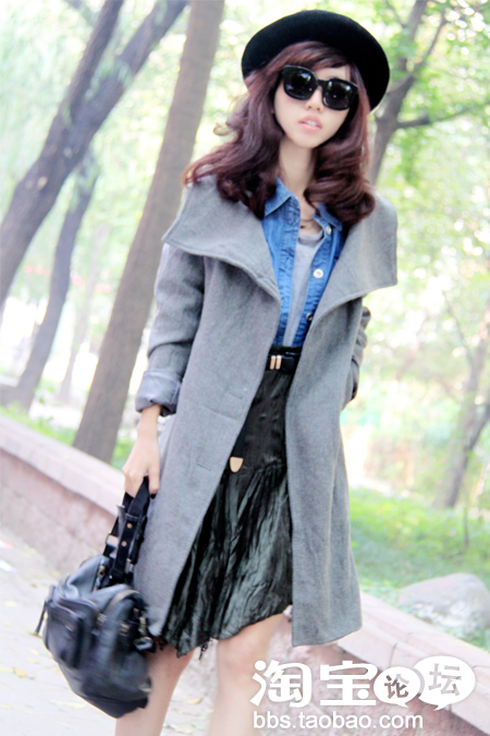 大翻领羊毛外套+牛仔衬衫+灰色打底+丝绒高腰裙